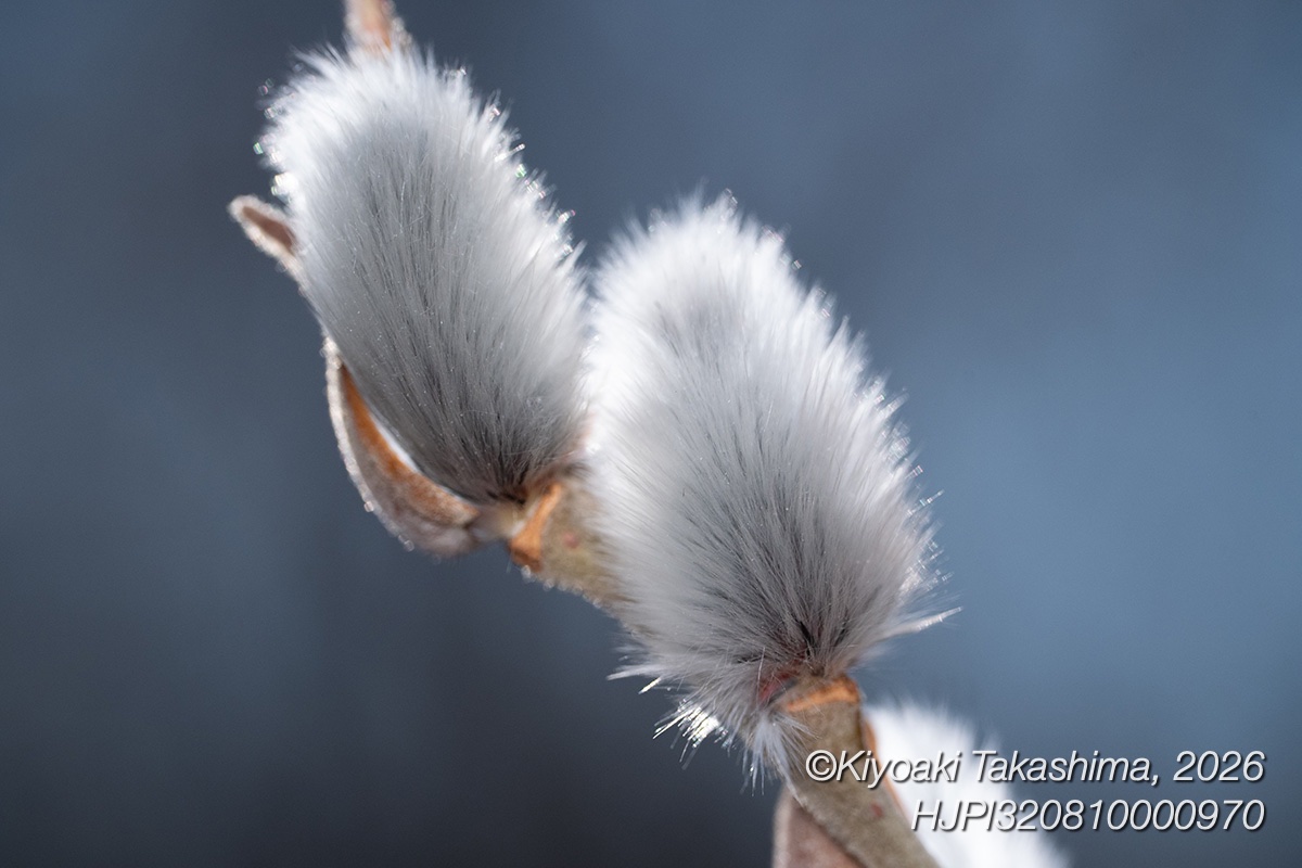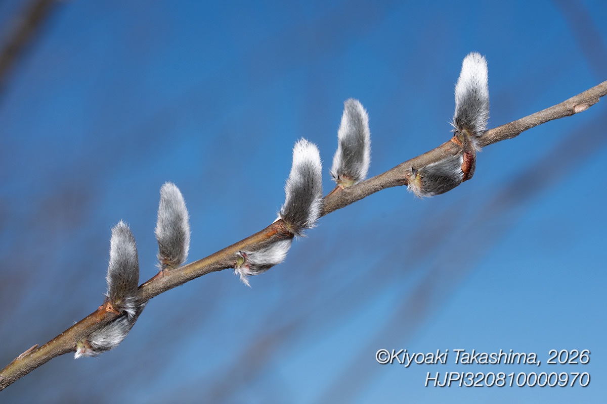 赤川にて。三川橋下の広場に車を止めて、付近を歩いてみました。ネコヤナギの冬芽が割れて、眩しいくらいに綿毛が輝いていました。