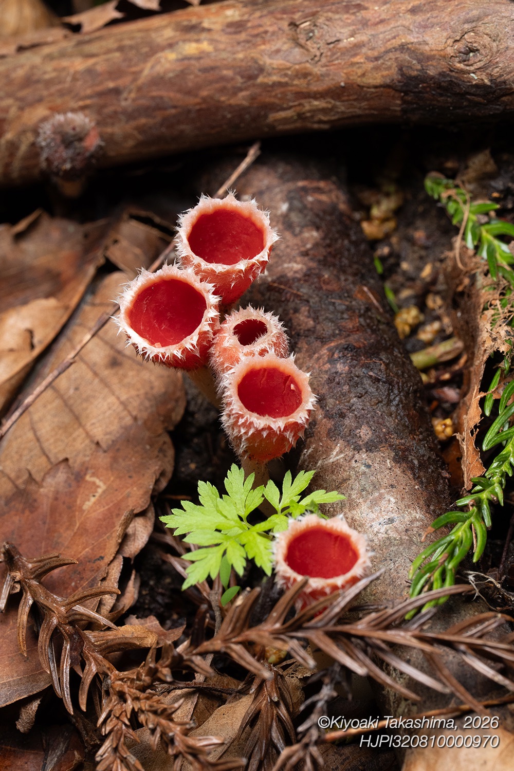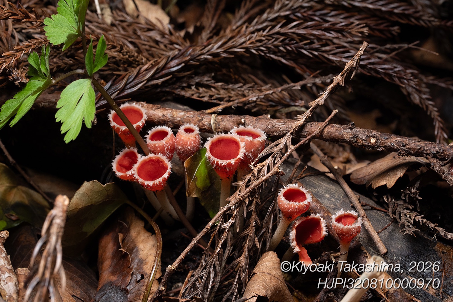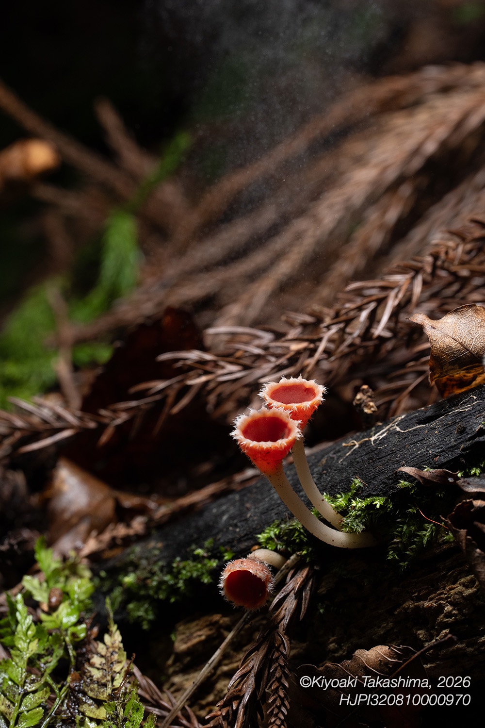 肉眼では胞子が出ているのか出ていないのか、よく見えません。それは林床で暗いためもありますが、それだけハイスピードな現象なためでもあります。写真にも写しにくく、そこでストロボの高速閃光です。