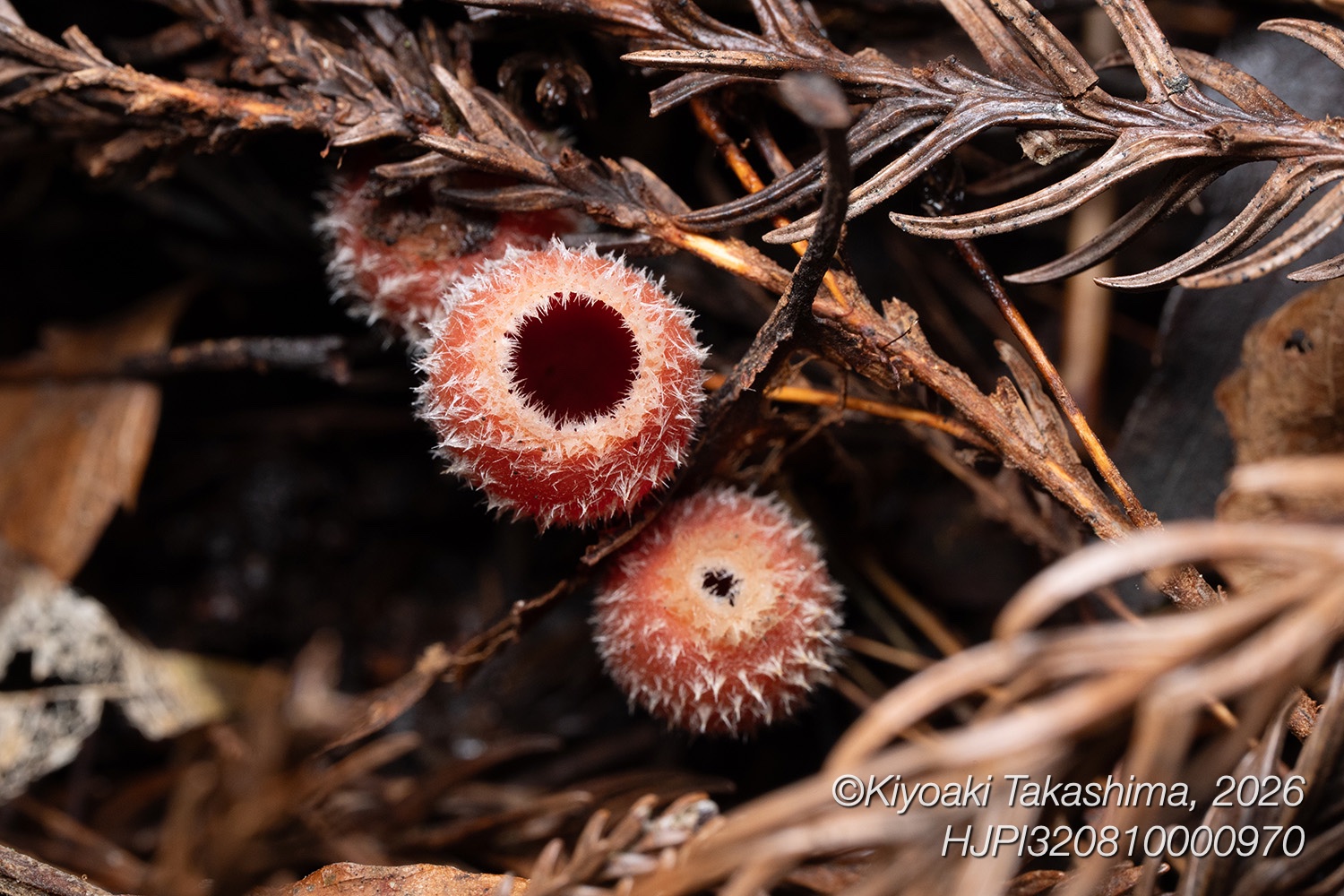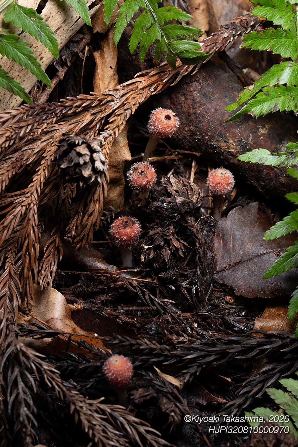 春、スギ林の林床に見られる1cmくらいの球形のキノコ。