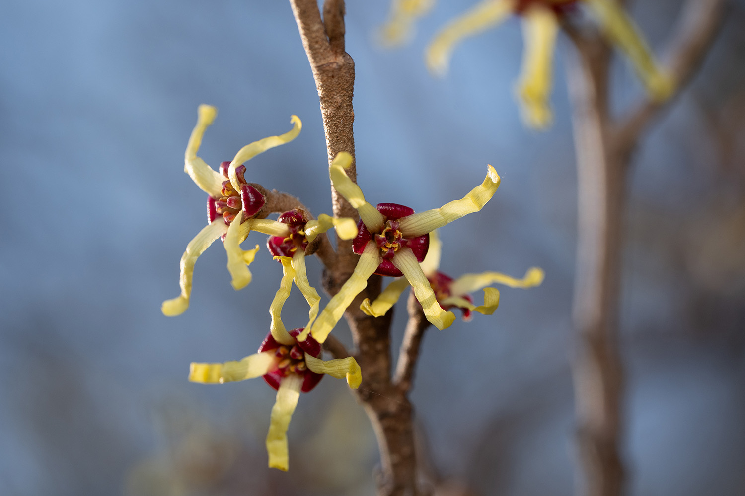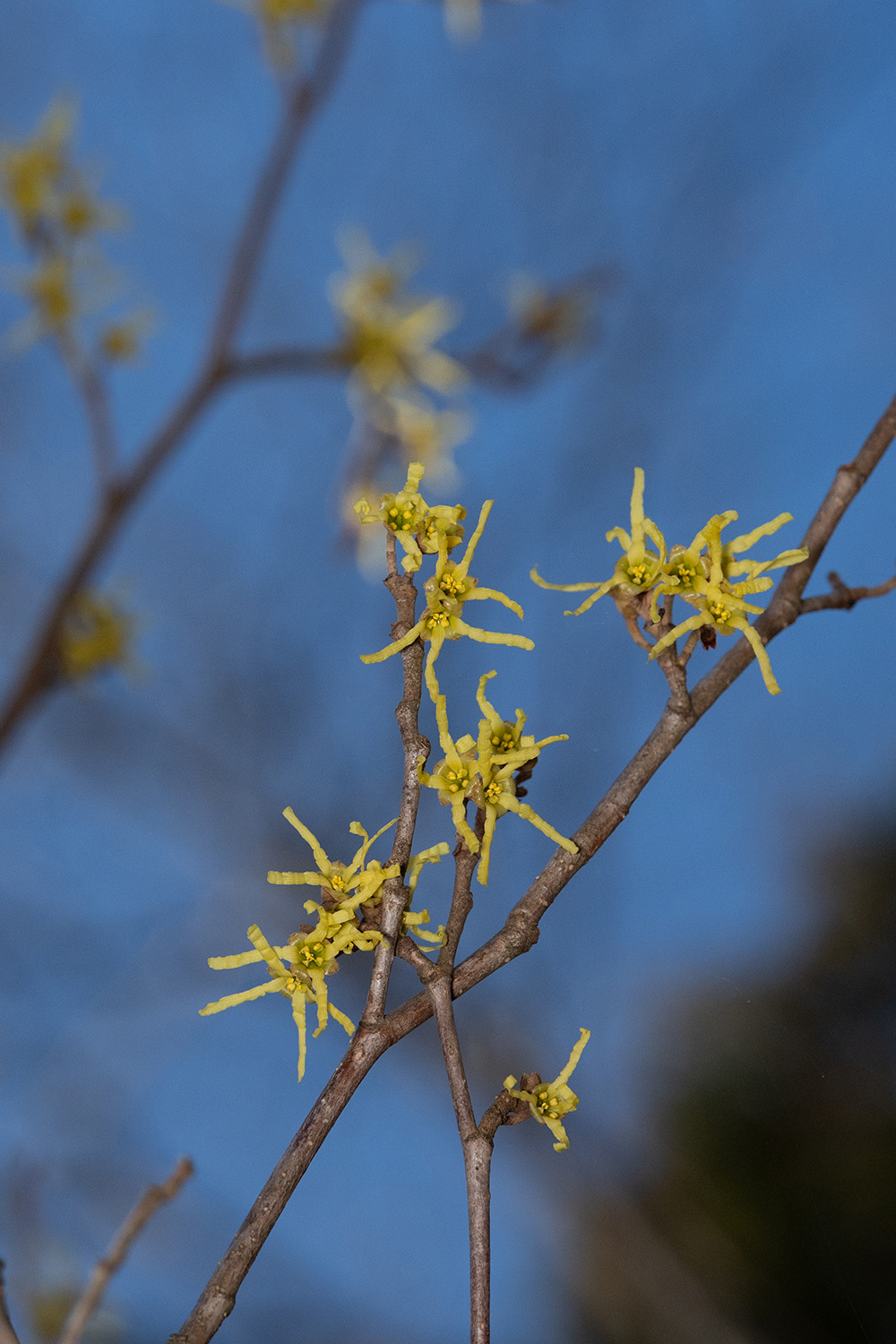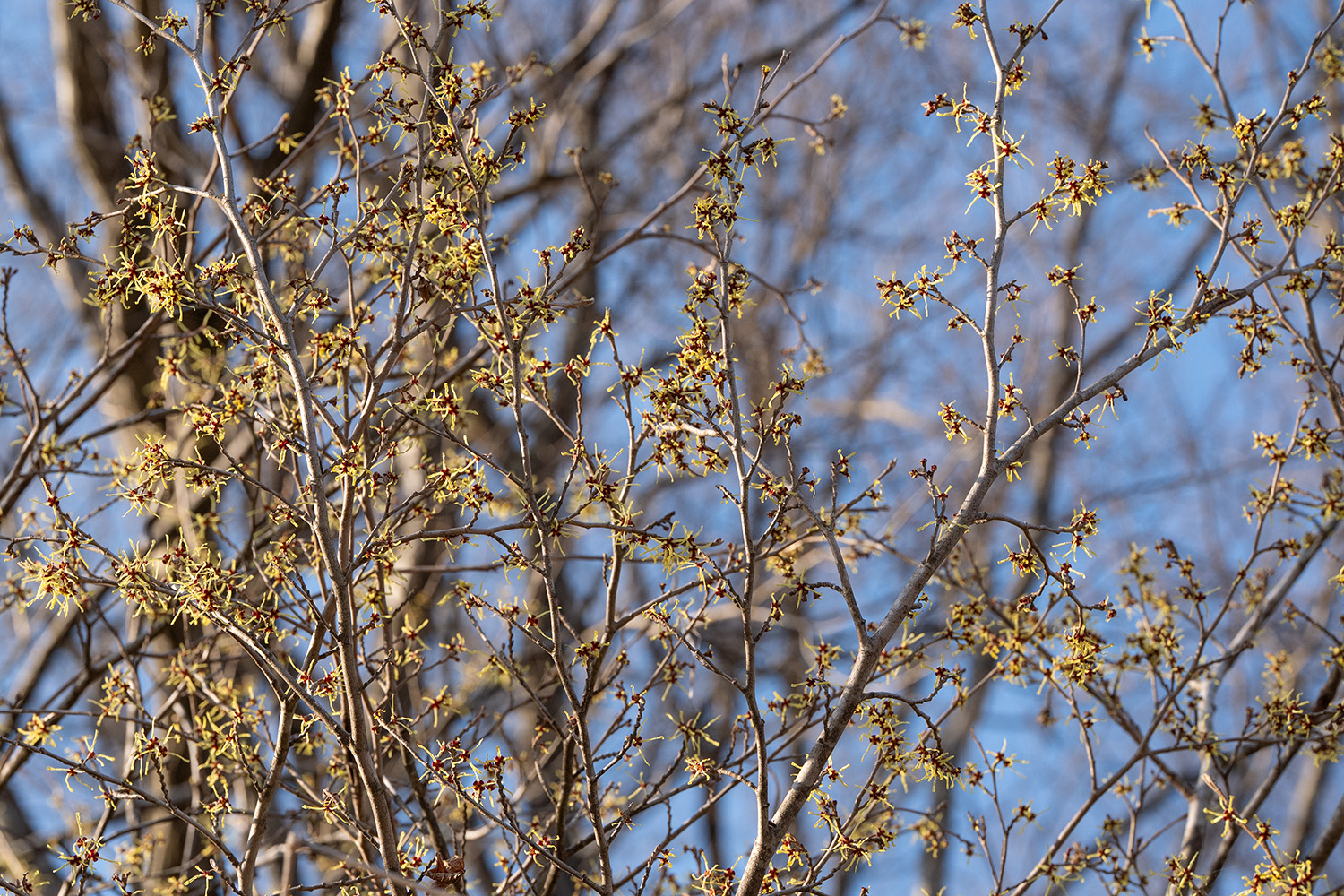鶴岡市井岡周辺、マルバマンサクが見頃を迎えています。萼が紅いのと、紅が薄くて全体が黄色く見えるがあります。それぞれアップします。