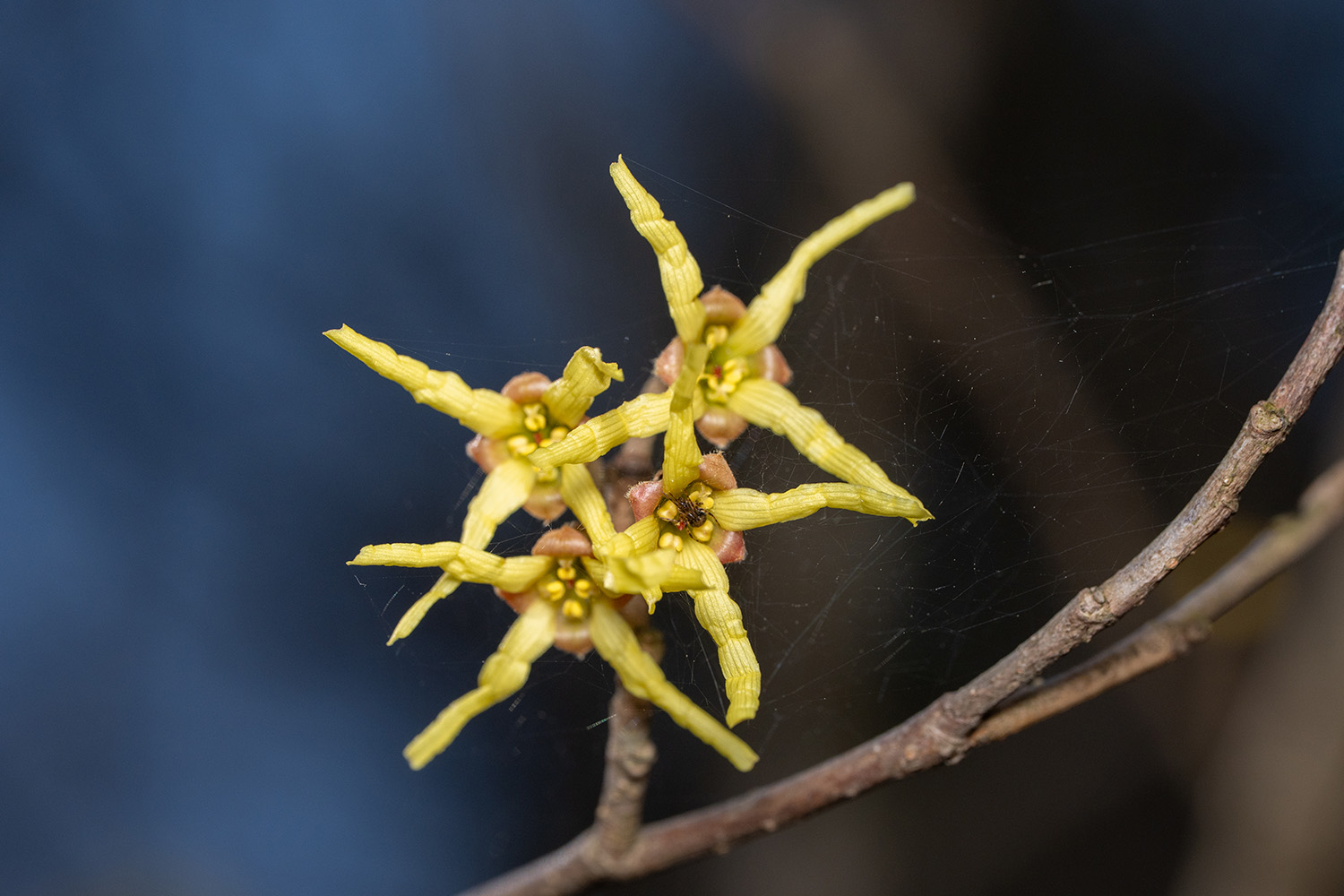 以前、曇った日でしたがマンサクに小さな虫が訪花しているのを見たことがあります。いつのことだったかブログにも載せていないので写真が行方不明で、その後、マンサクを見ては虫が来ていないかもチェックするのですが、機会にめぐまれていません。クモがわざわざここに巣を張っているのも虫を待っているからに違いないのですが・・・