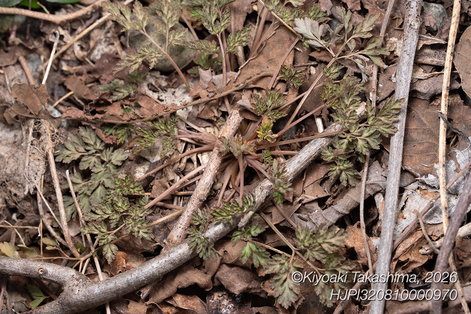 食草のムラサキケマンのそばにいます。この食草も落ち葉に紛れて非常に見えにくくなっています。答は・・・↓