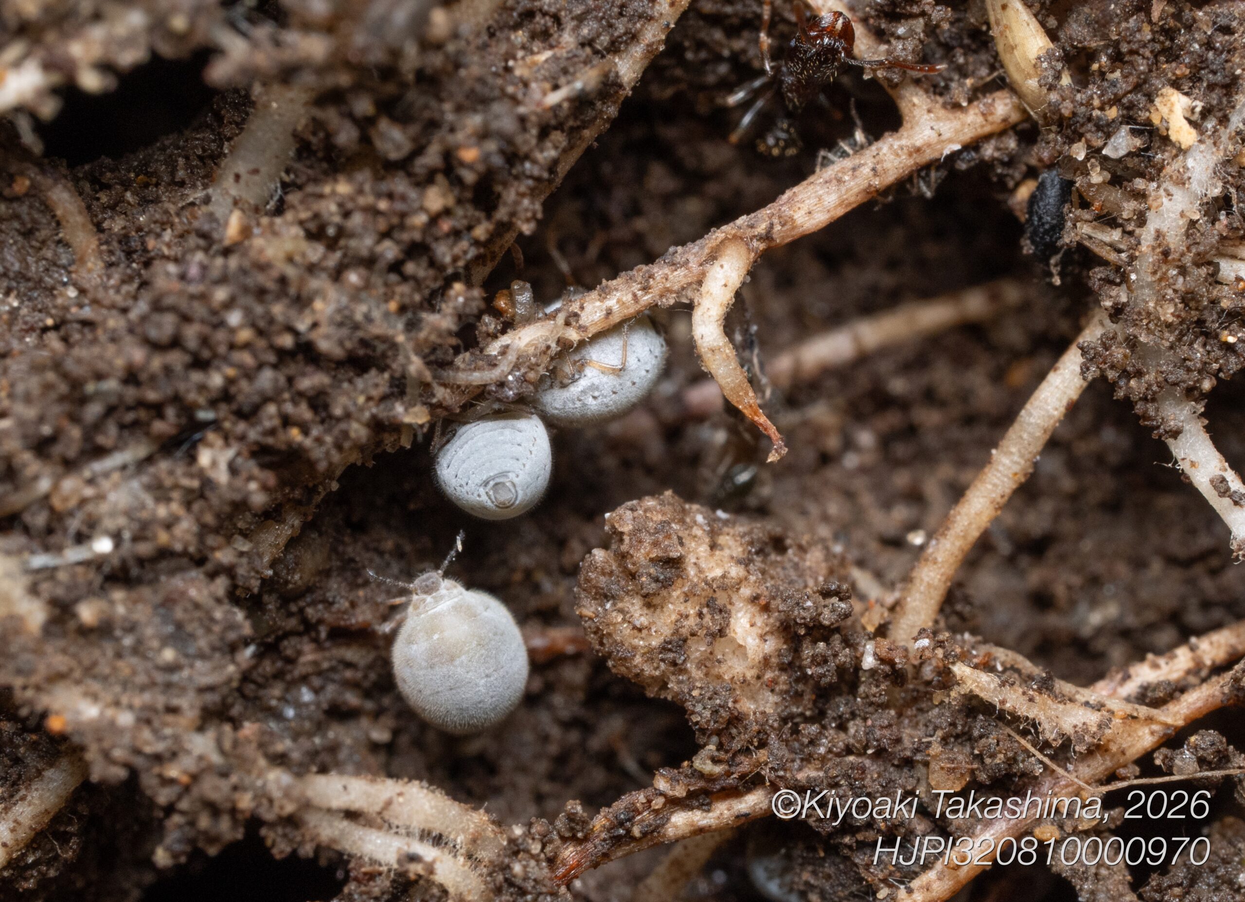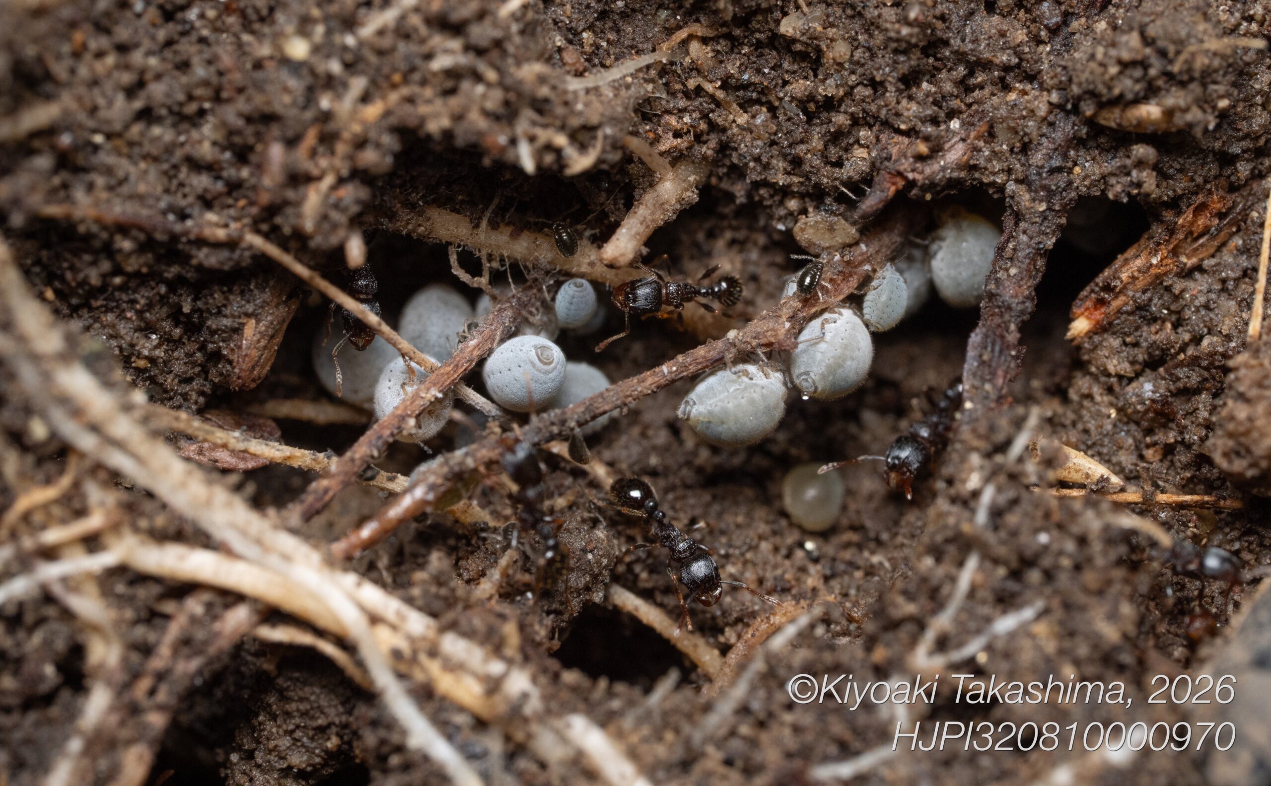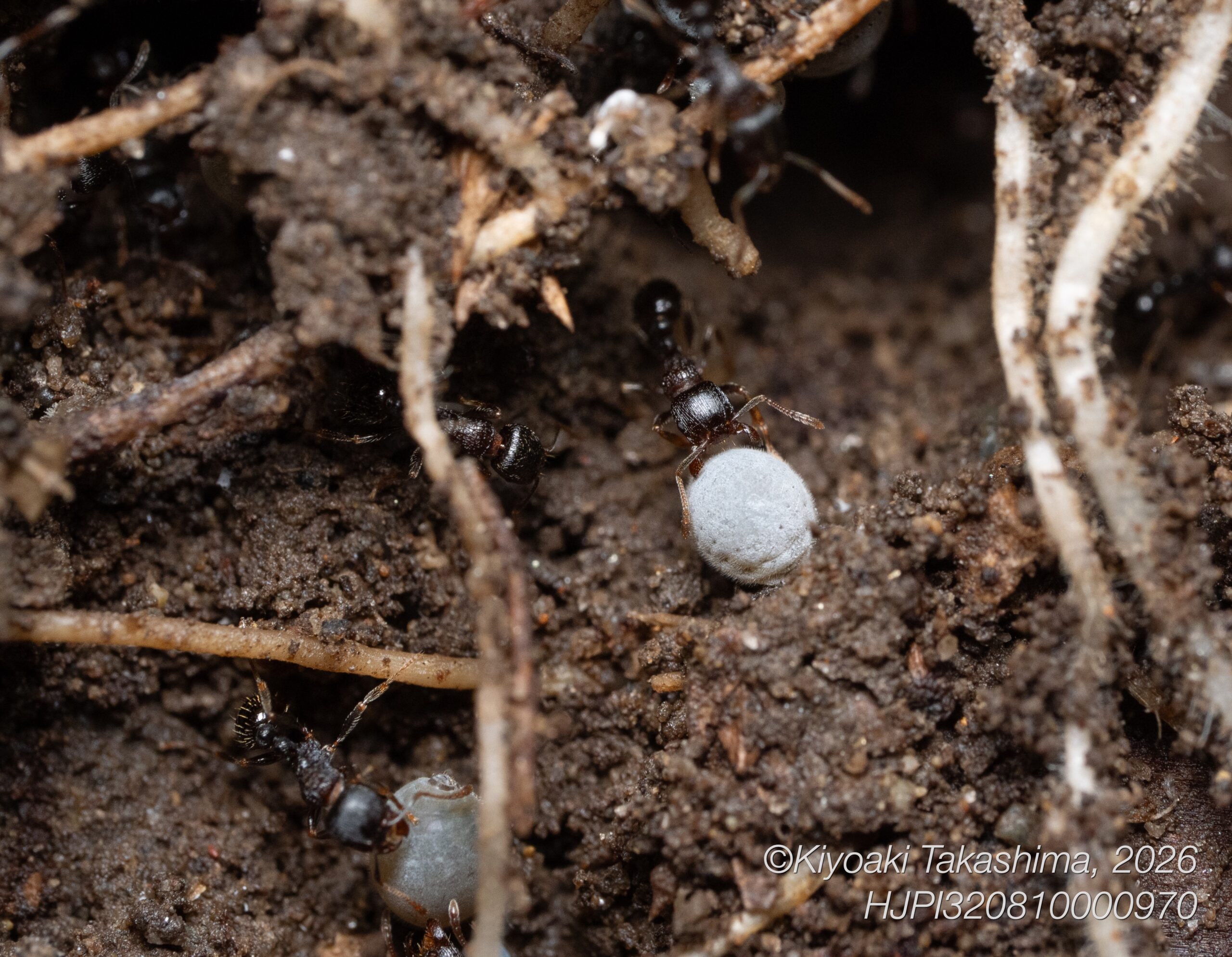 巣から巣への移動だと思います。ちょっとしたお引越し。私がビロードツリアブを撮影している足もとで、何匹ものクロヤマアリが、こうしてなかまをくわえて一方方向に移動していきました。