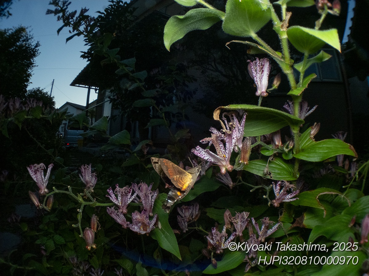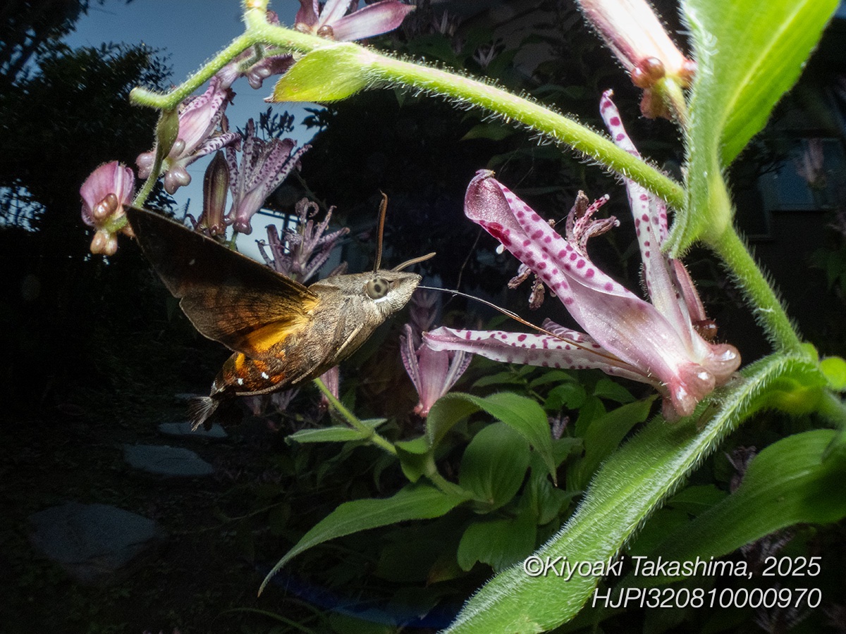 晴れた日中にはまず訪れることはありません。早朝や日没前後の薄暗い時間に静かに吸蜜していることが多いです。小雨の降るなか来ることもあります。鳥など天敵を避けて行動しているのでしょう。ホバリングで飛翔筋を活発に動かすことで、体温を高めて、気温が低いなかでも活動できるようです。