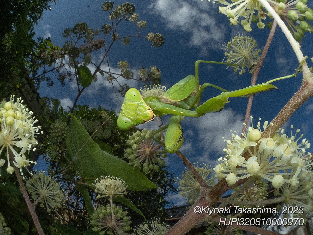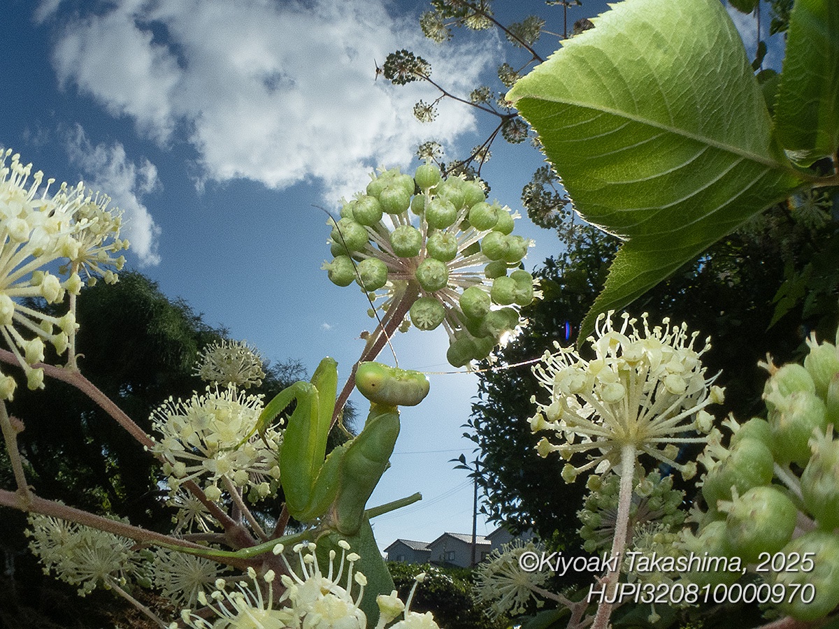 今回の動画は庭のウドに取りついた一匹を追ったものです。実はウドの葉上に落ちたアブラムシの甘露を求めて飛び回るアメリカミズアブの動きが面白く、カメラを向けていたのですが、気がついたら画面にハラビロカマキリが現れて・・・1カット目はそんなシーンです。
