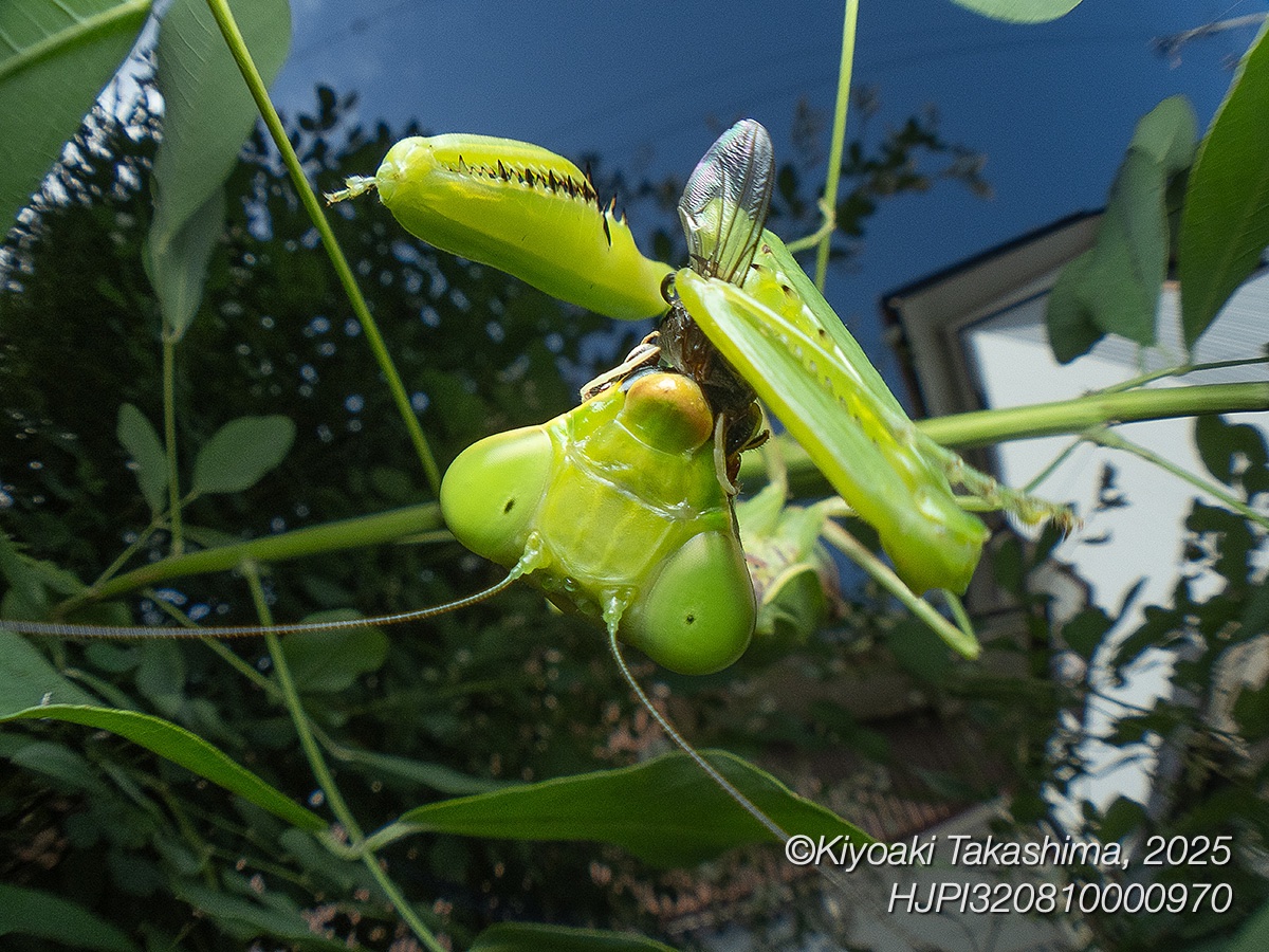 その後、花に移ってハナアブやハエを狙い始めました。こんなに積極的に狩りを続けるのはオオカマキリではあまり見たことがありません。数時間にわたって積極的に獲物を狙ってくれて、私もカメラから離れられなくなってしまいました。でも、とらえた瞬間を撮影できたのは2回だけでした。見えないところでハエを撮る瞬間があったり、 一度は飛んでいるハチを空中でキャッチしたのを裏撮りで失敗しました。これは悔しかったです。